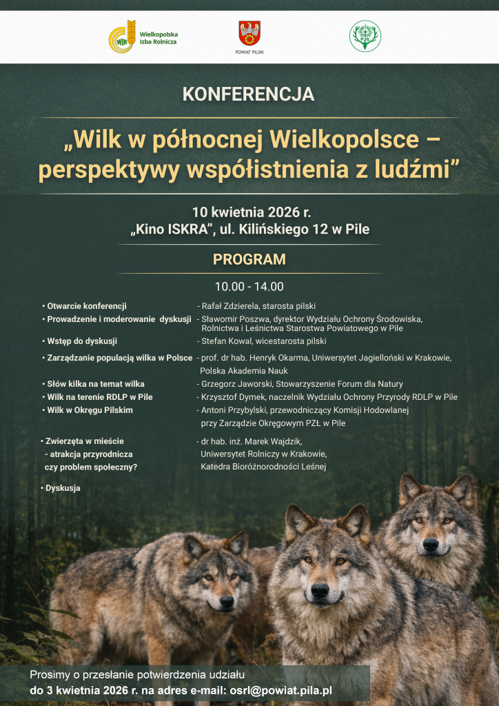 Serdecznie zapraszamy na Konferencję pt. „Wilk w północnej Wielkopolsce -perspektywy współistnienia z ludźmi”, która odbędzie się w dniu 10 kwietnia 2026 roku w „Kinie Iskra” przy ul. Kilińskiego 12 w Pile. ![]()